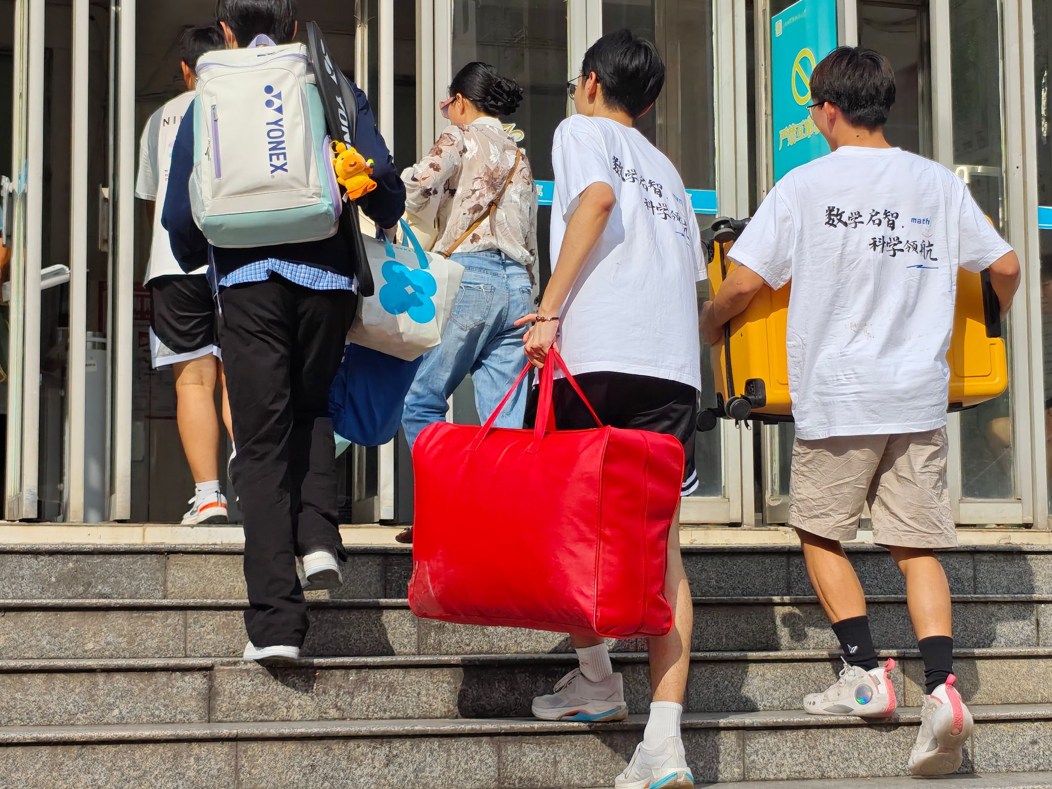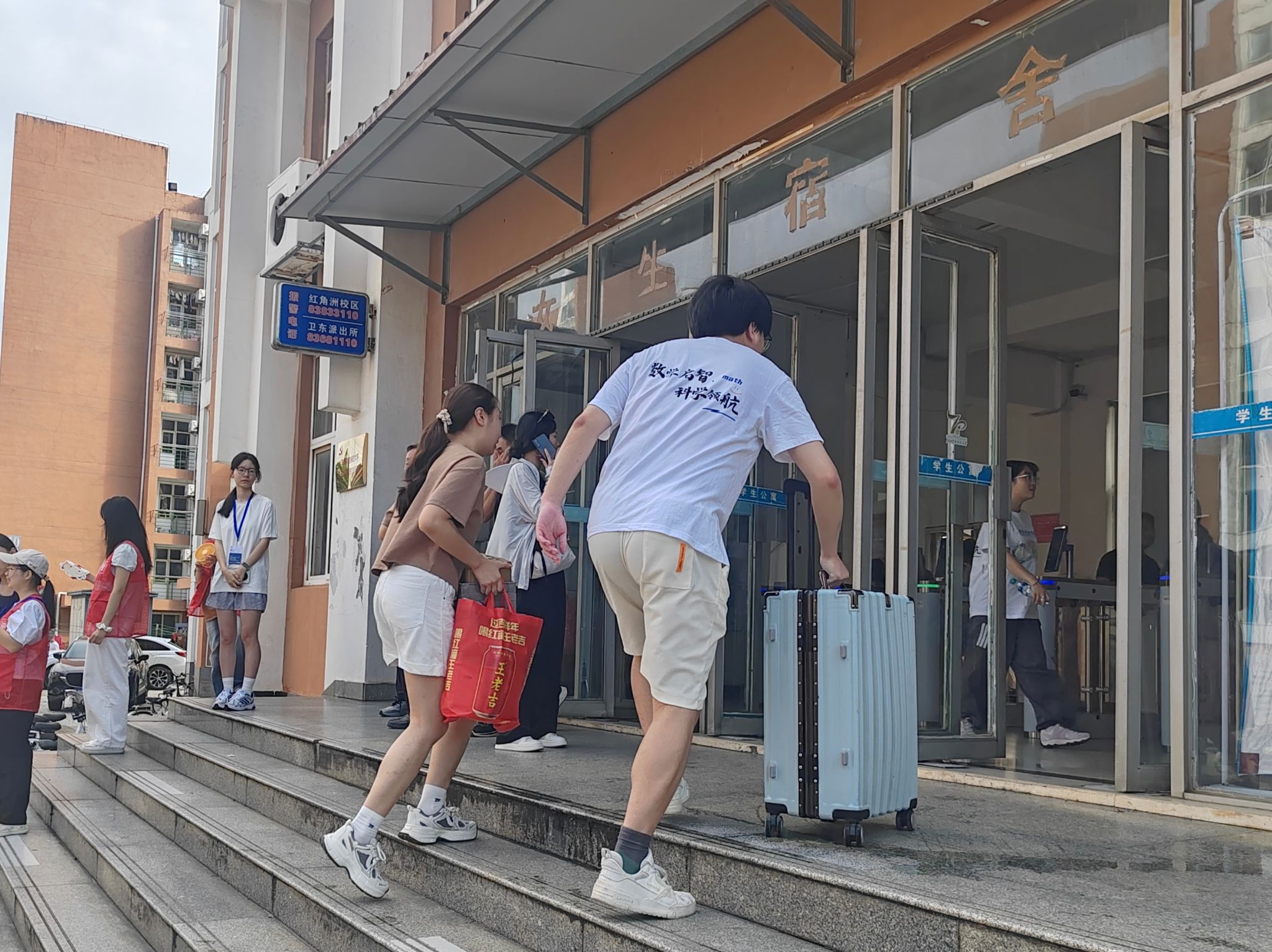 活动前夕,受助学子志愿者做足准备,主动走进新生宿舍,热情地向新生及家长介绍宿舍设施的使用方法、分享校园生活的实用信息,并耐心解答有关食堂、教学楼位置等常见问题。他们不惧炎热,一次次穿梭于校门与宿舍楼之间,主动帮新生搬运行李箱、被褥等重物。志愿者们用踏实而温暖的服务,默默搭建起一条从校门到寝室的“爱心通道”,让报到流程更加顺畅。